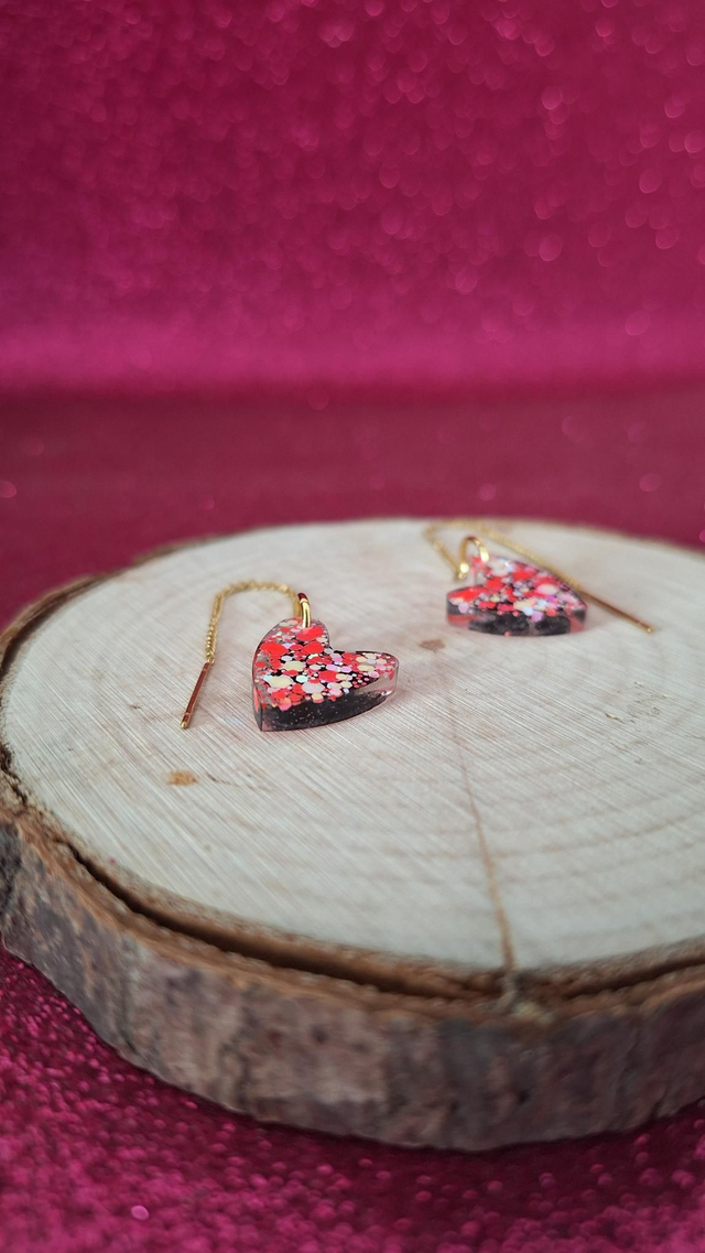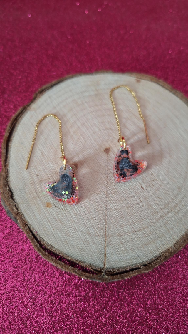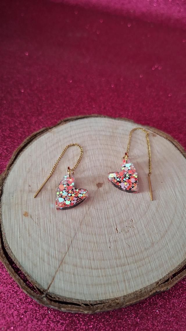 Boucles d'oreilles à enfiler dorées cœurs paillettes Corails/blanches + encre noire