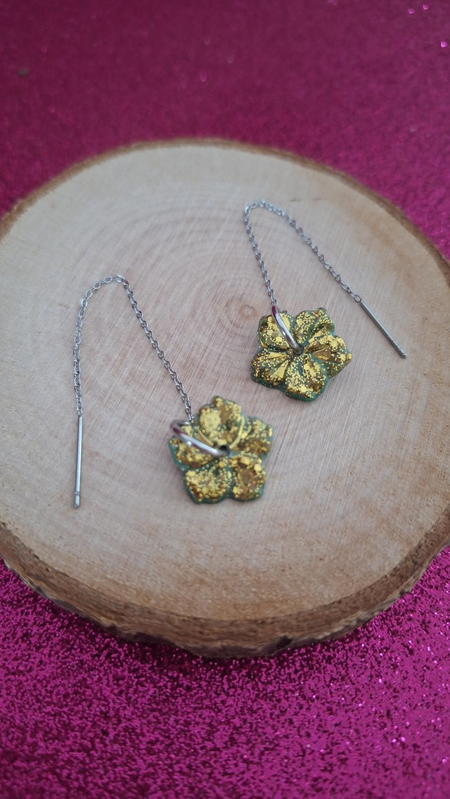 Boucles d'oreilles à enfiler hibiscus verts et paillettes dorées