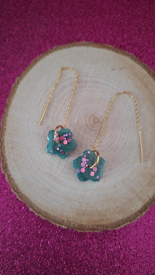 Boucles d'oreilles à enfiler hibiscus verts et paillettes roses