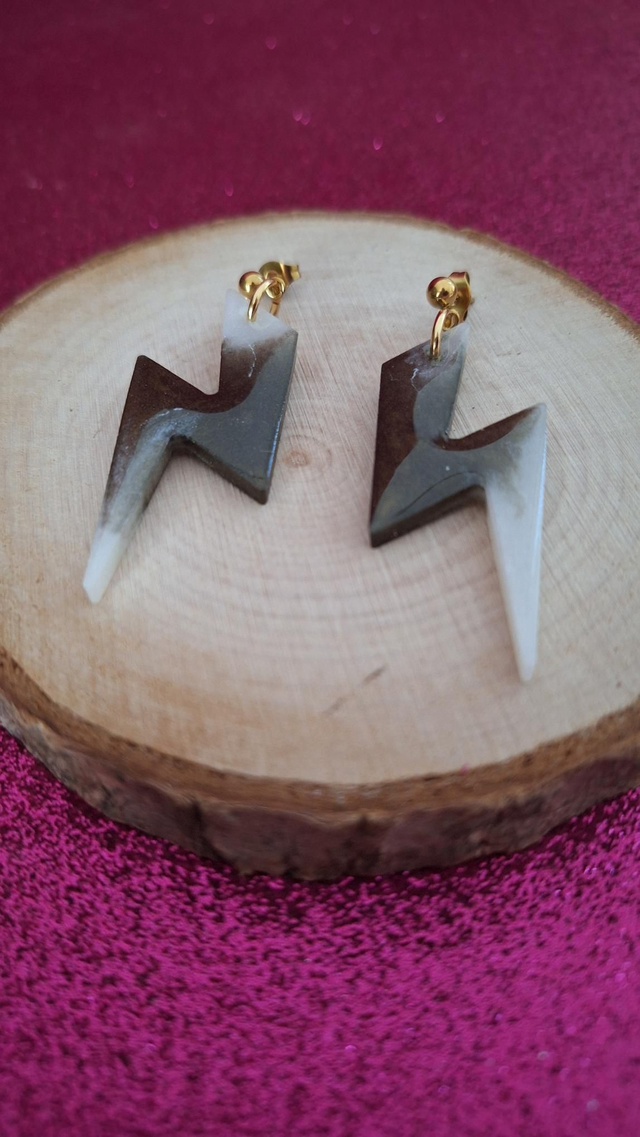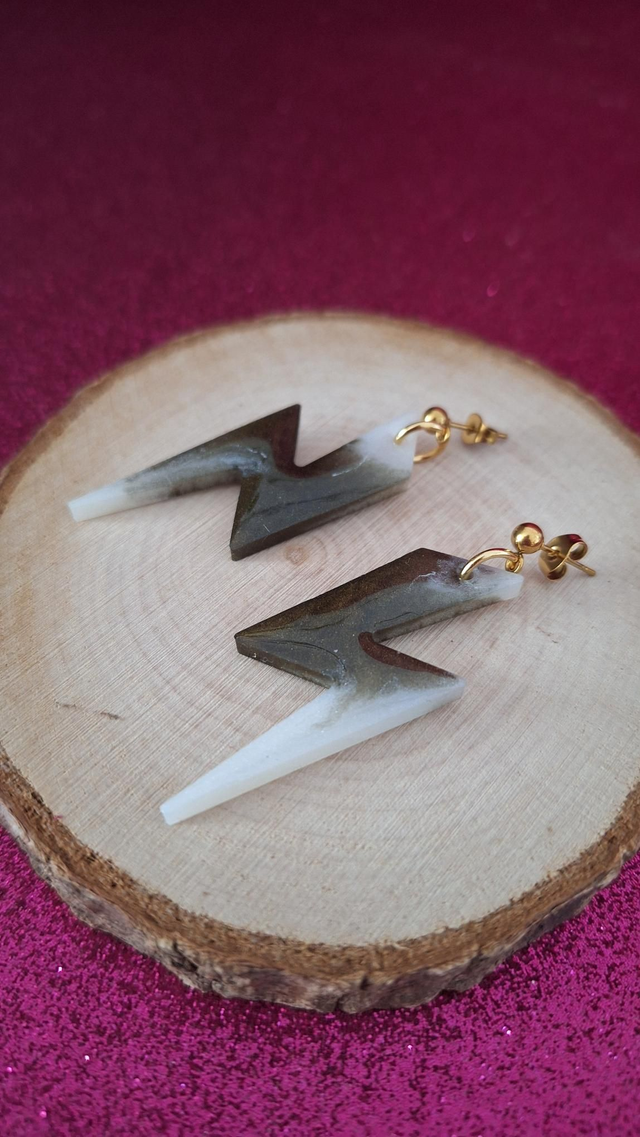 Boucles d'oreilles dorées éclairs kaki et blanc