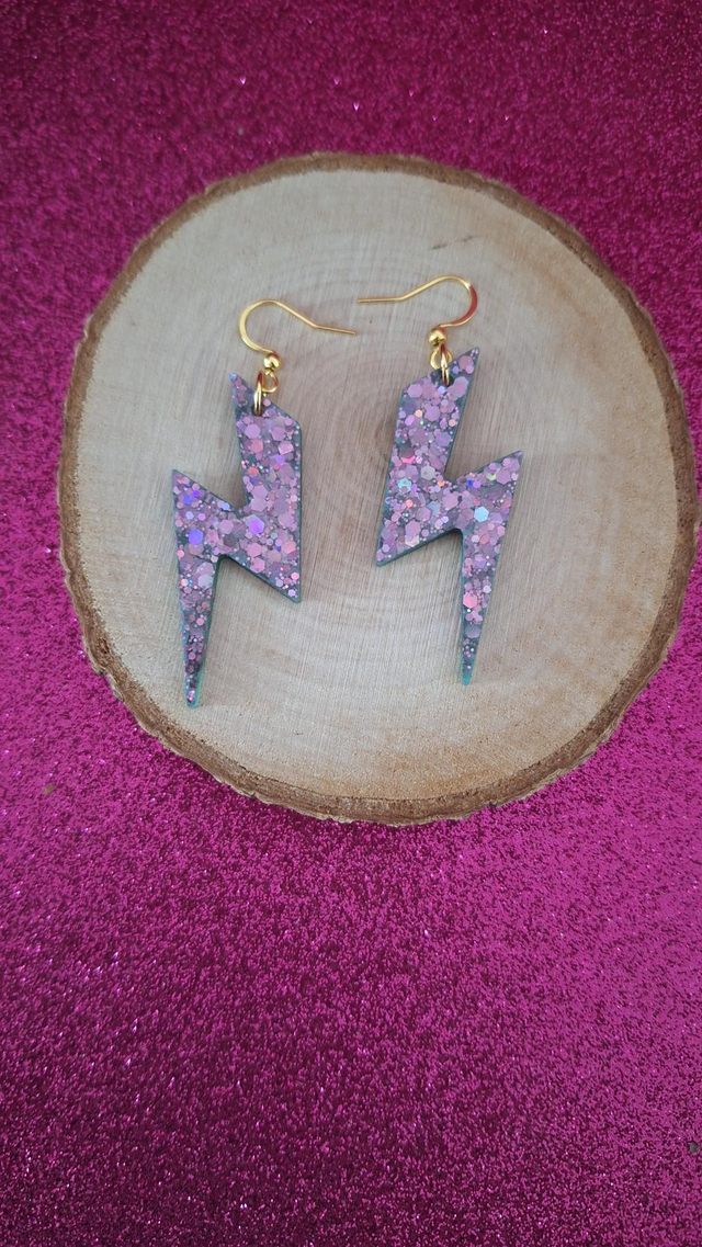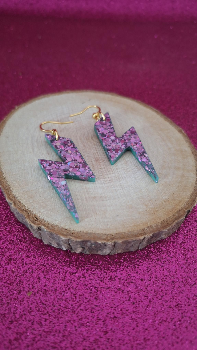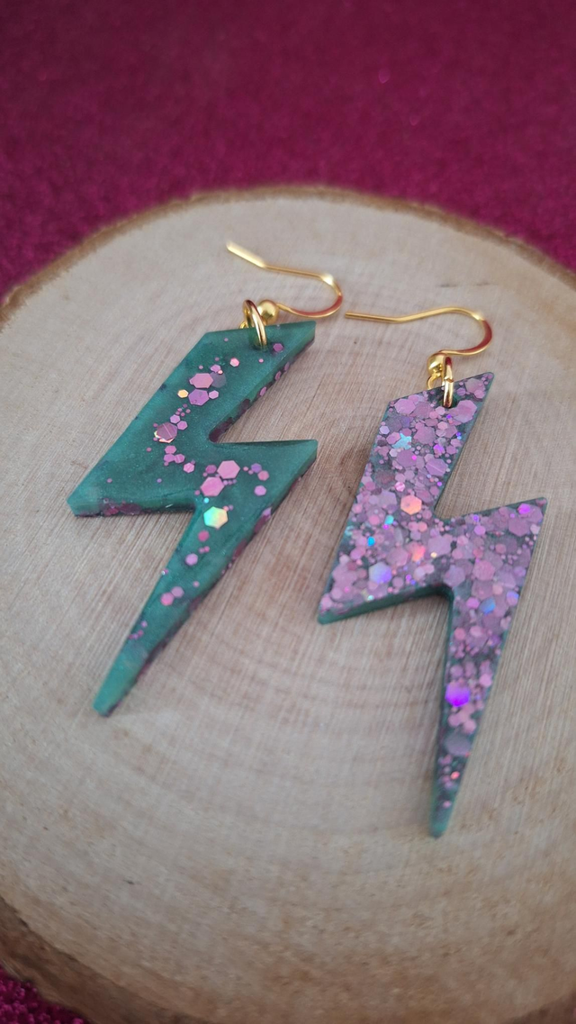 Boucles d'oreilles éclairs vertes et paillettes roses