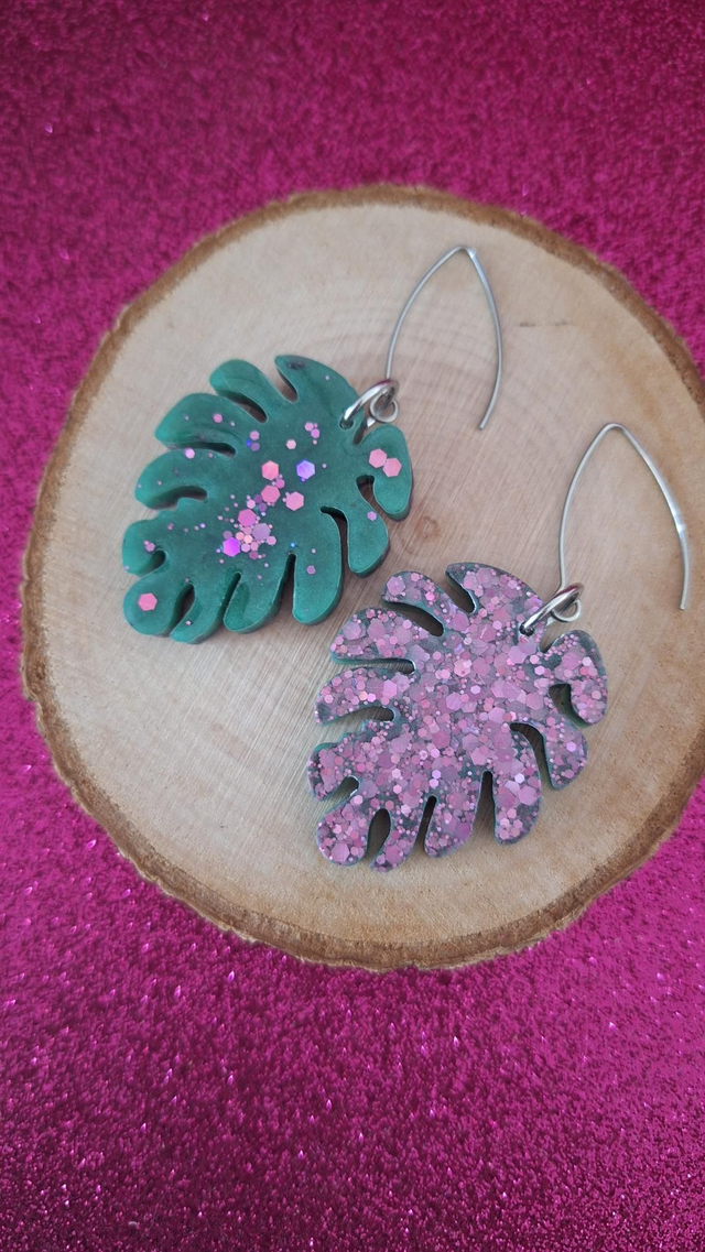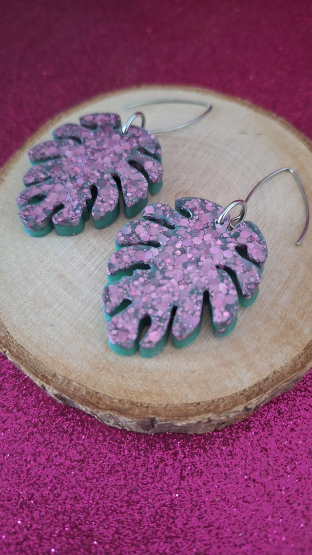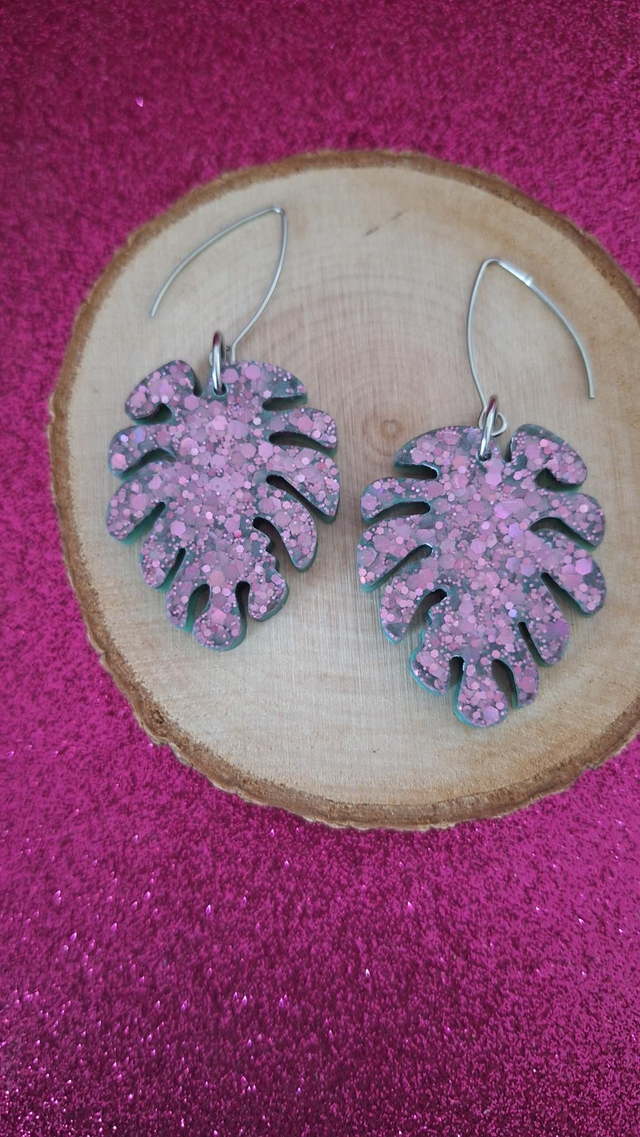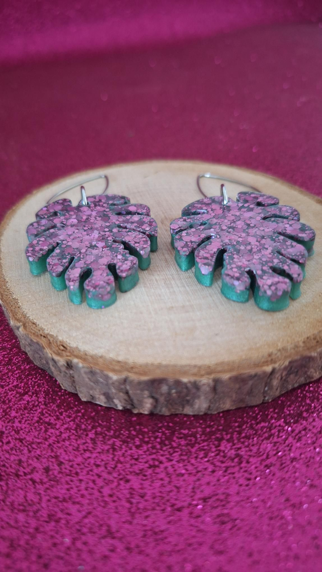 Boucles d'oreilles feuilles vertes et paillettes roses