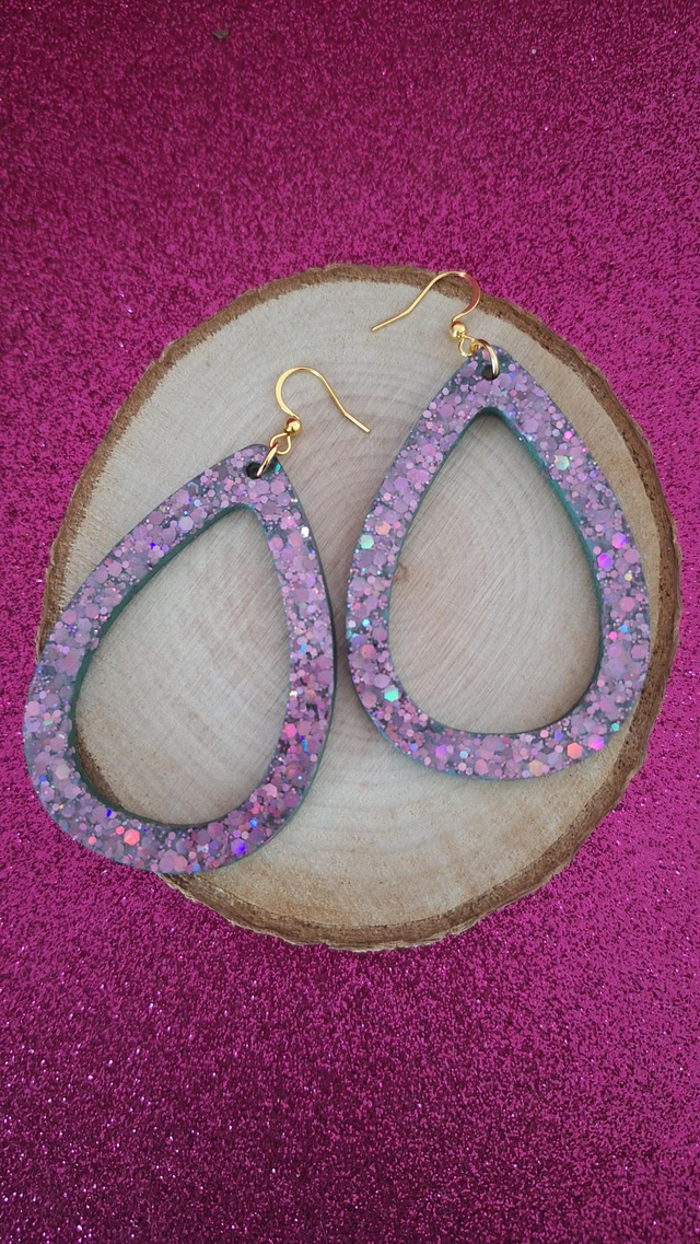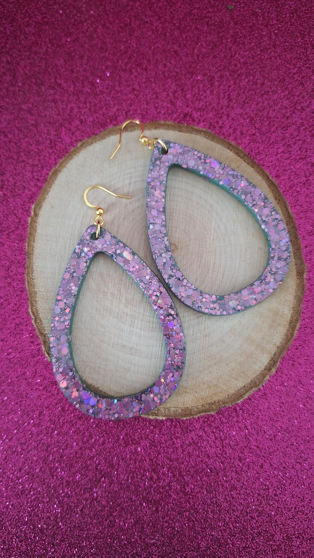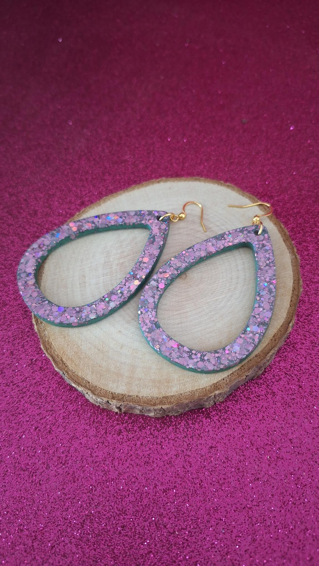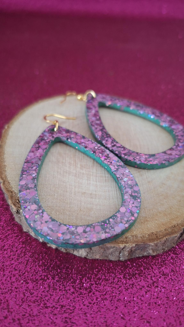 Boucles d'oreilles maxi gouttes vertes et paillettes roses