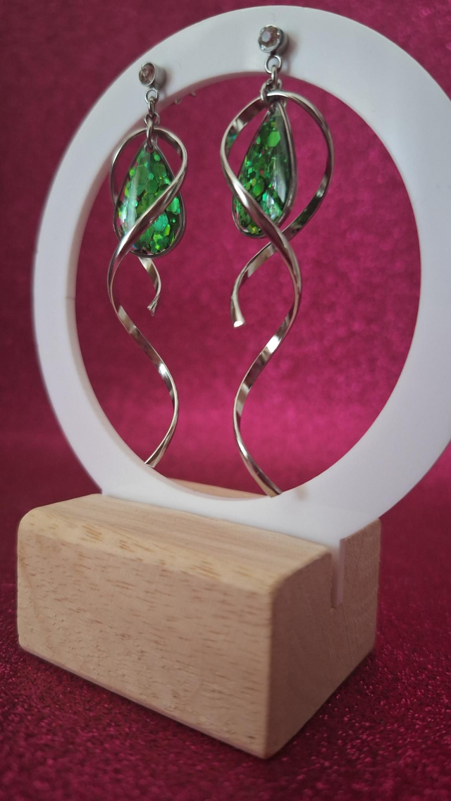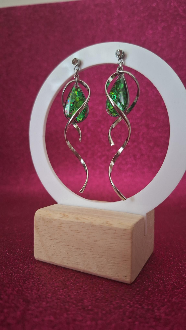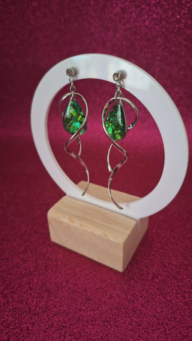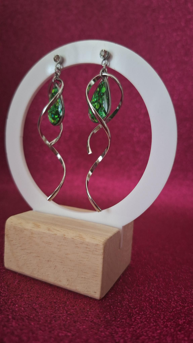 Boucles d'oreilles spirales argentées gouttes paillettes vertes