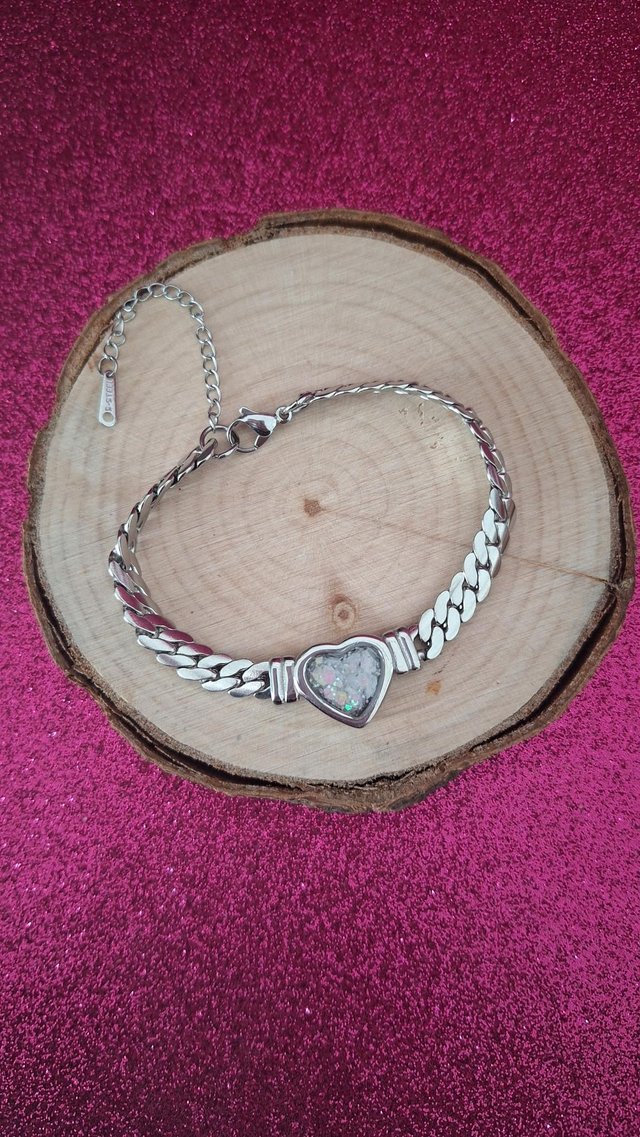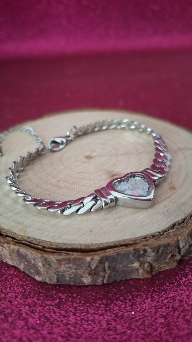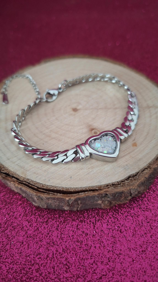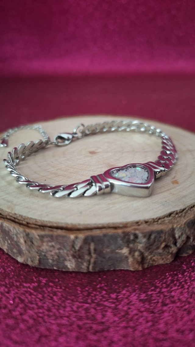 Bracelet argenté gros maillons cœur paillettes blanches Holographiques
