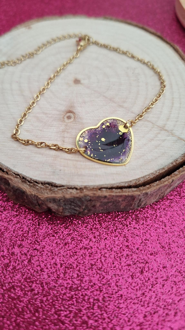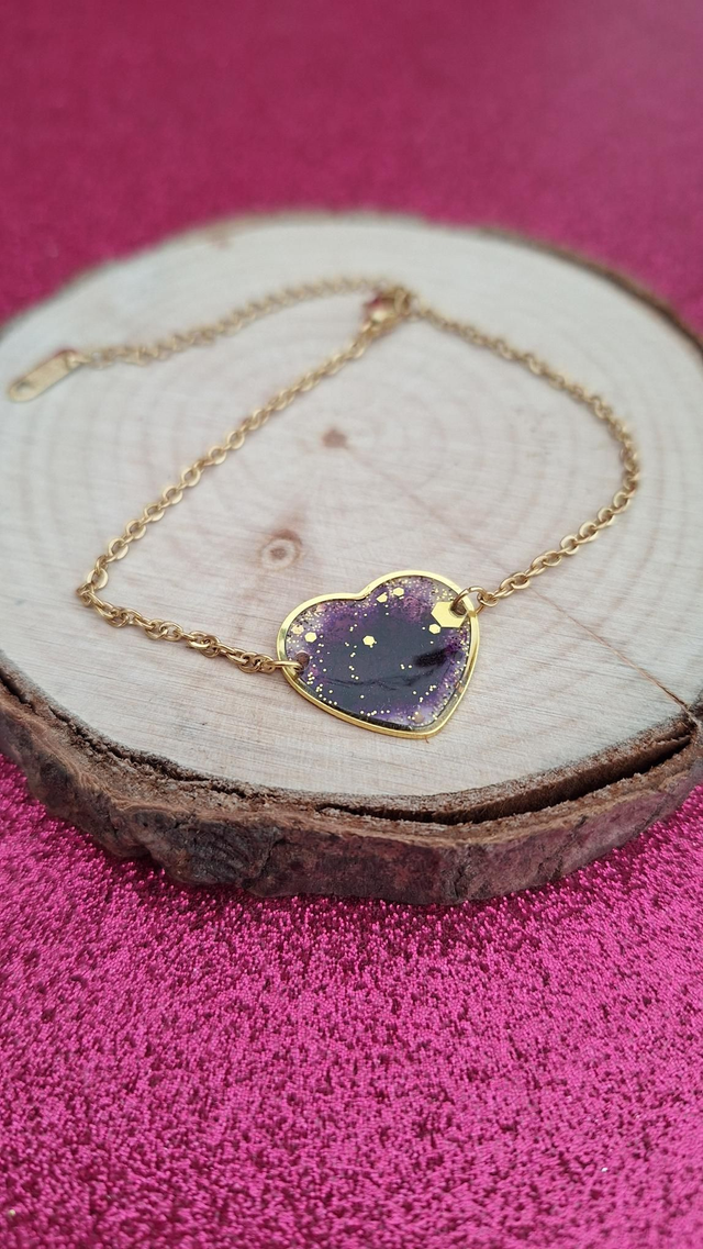 Bracelet doré cœur violet et paillettes dorées