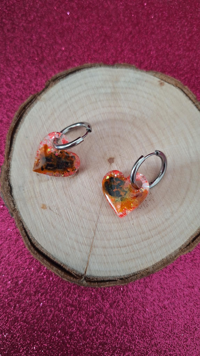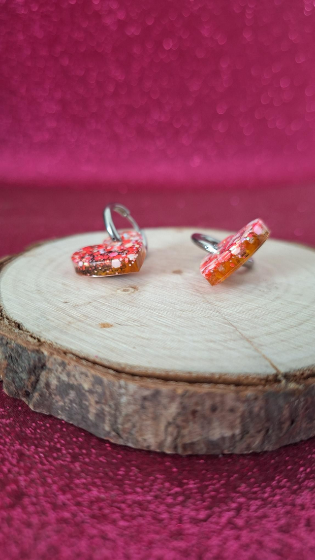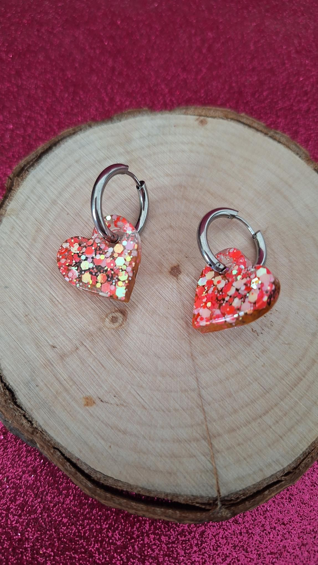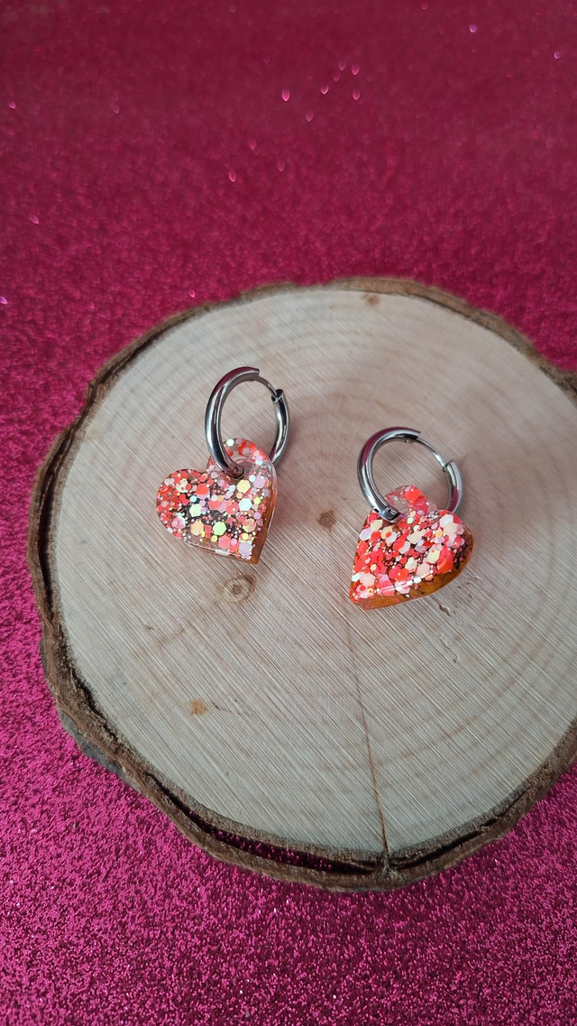 Créoles argentées cœurs paillettes Corails/blanches + encre noire et dorée