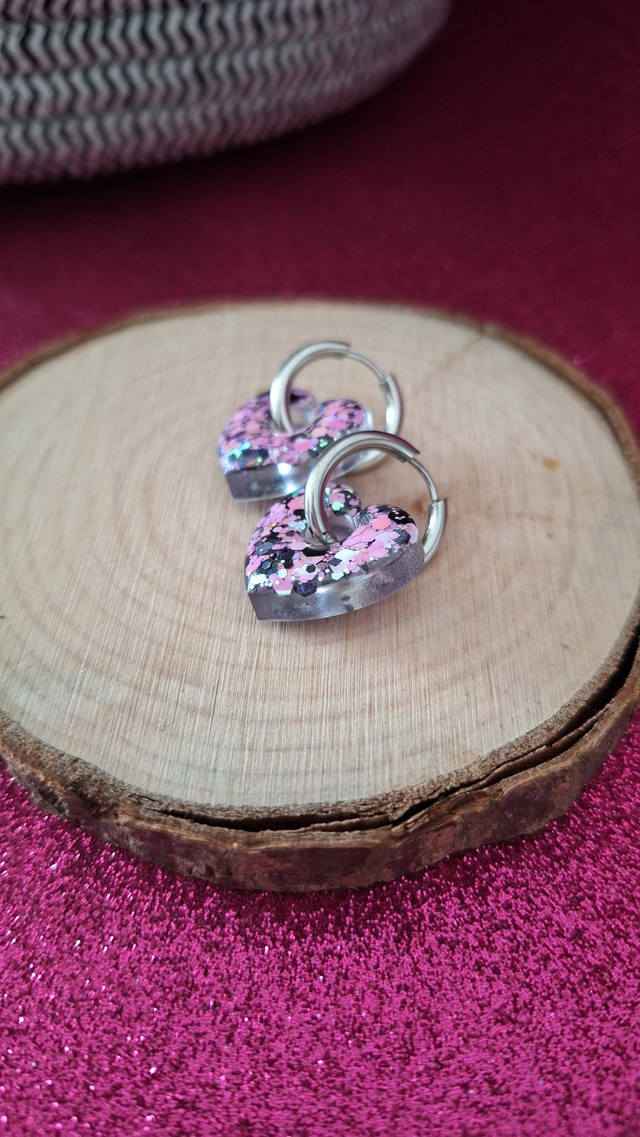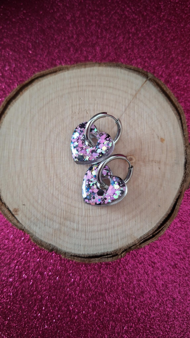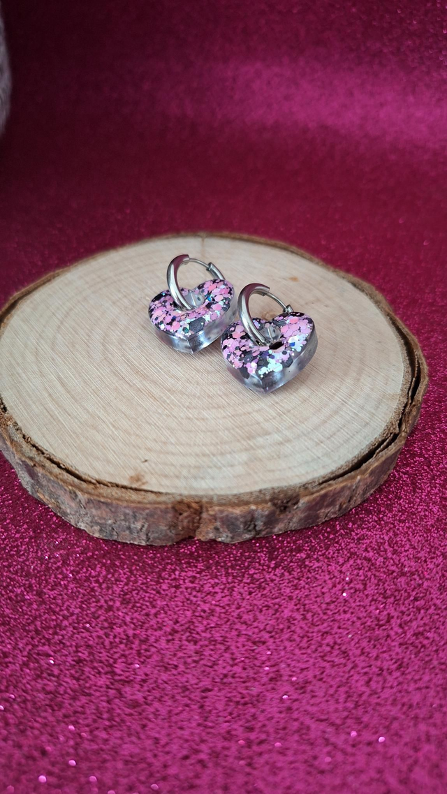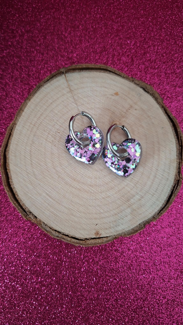 Créoles argentées cœurs paillettes noires/roses/blanches