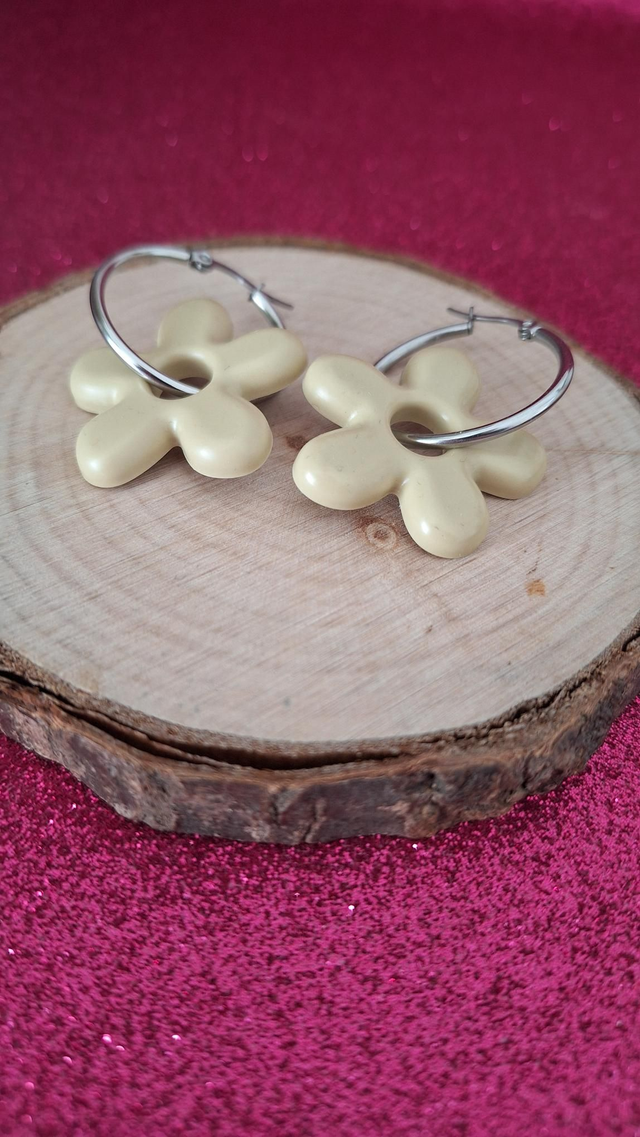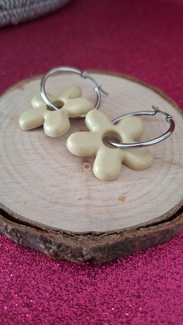 Créoles argentées fleurs beige