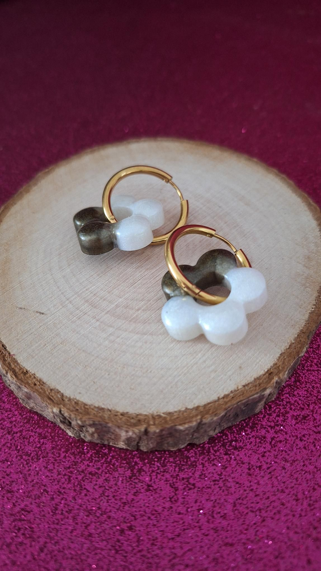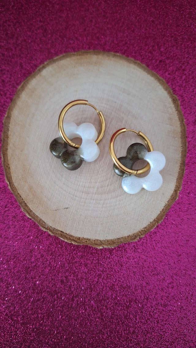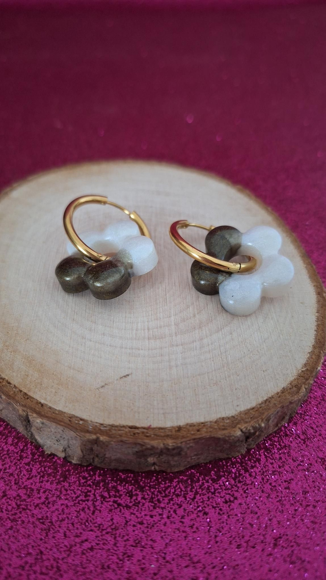 Créoles dorées fleurs kaki et blanc